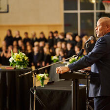 Tuesday's ceremony included a territorial welcome and song by Ronald Francis-Modeste of Mathxwí First Nation. Ardaas Sukdev Singh from Khalsa Diwan Society Abbotsford and Pastor Mitch Borrows from Hill City Church brought blessings to the event. Students from Irene Kelleher Totí:ltawtxw's Choir, led by Amanda Schoepp, performed "A Wish for Peace" and also led the room through the singing of O Canada.